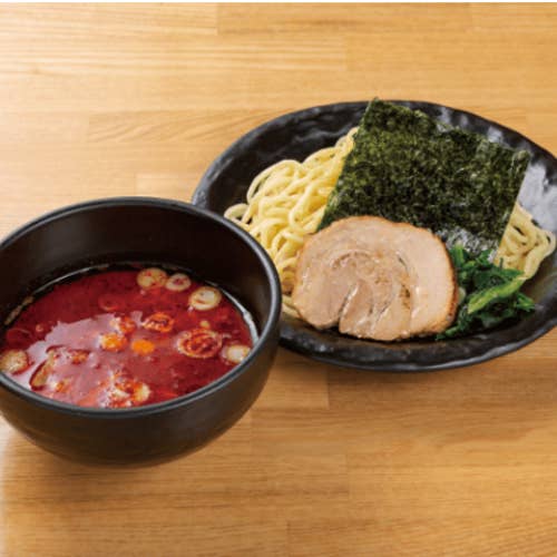 ラーメン大桜の赤つけ。ピリ辛でゴマの効いたスープにキュッとしまった麺がよく絡みます。